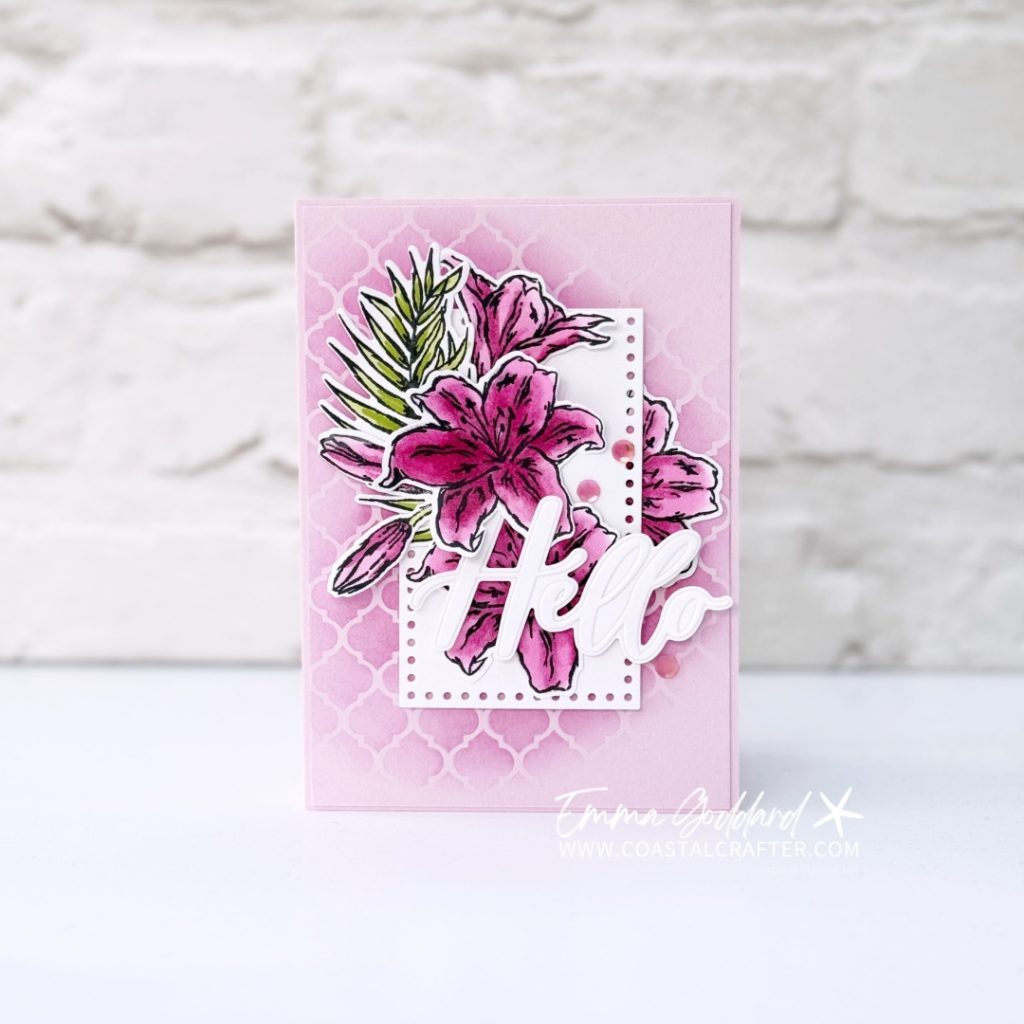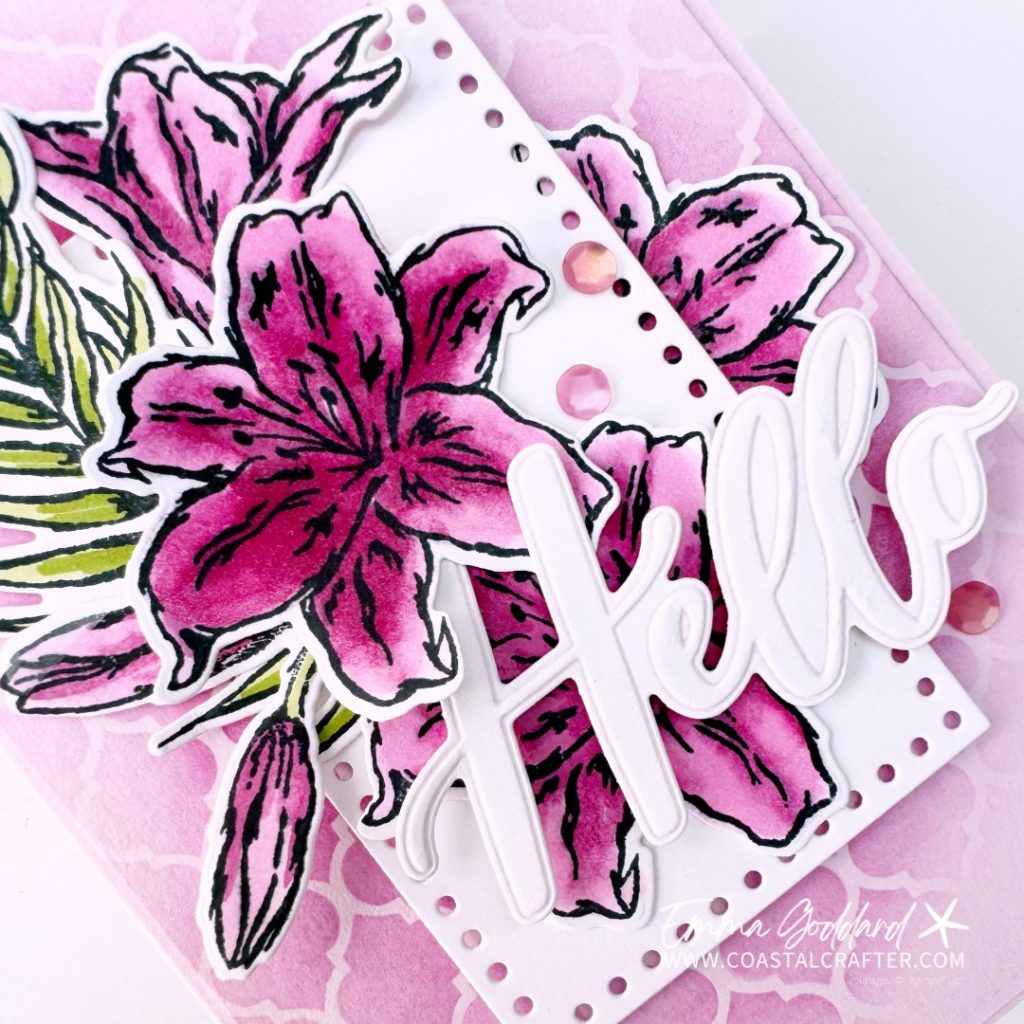 The Lilies have been stamped in Memento Ink and coloured with the Berry Burst and Bubble Bath Stampin’ Blends. Once coloured, I have die cut these out and layered them together with two pieces I had on my desk. This Everyday Details Rectangle Die, was a left over piece from a recent class and the Hello was from me practicing with this Thoughtful Moment Hybrid Embossing folder and dies.