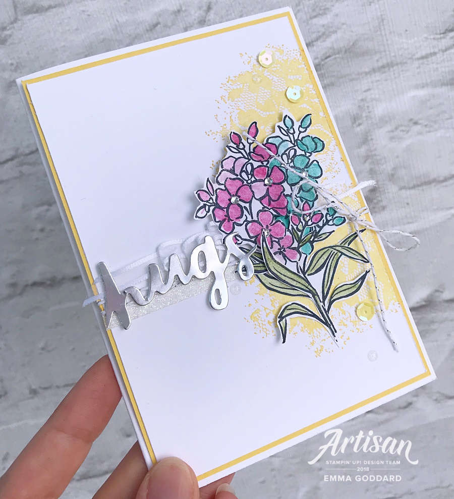 I had previously been creating with Southern Serenade so had this stamp set ready to go on my desk. The lace stamp makes such a delicate background, I have previously stamped this in more muted coloured such as pale pinks and pale browns but loved the look this gave in daffodil delight.