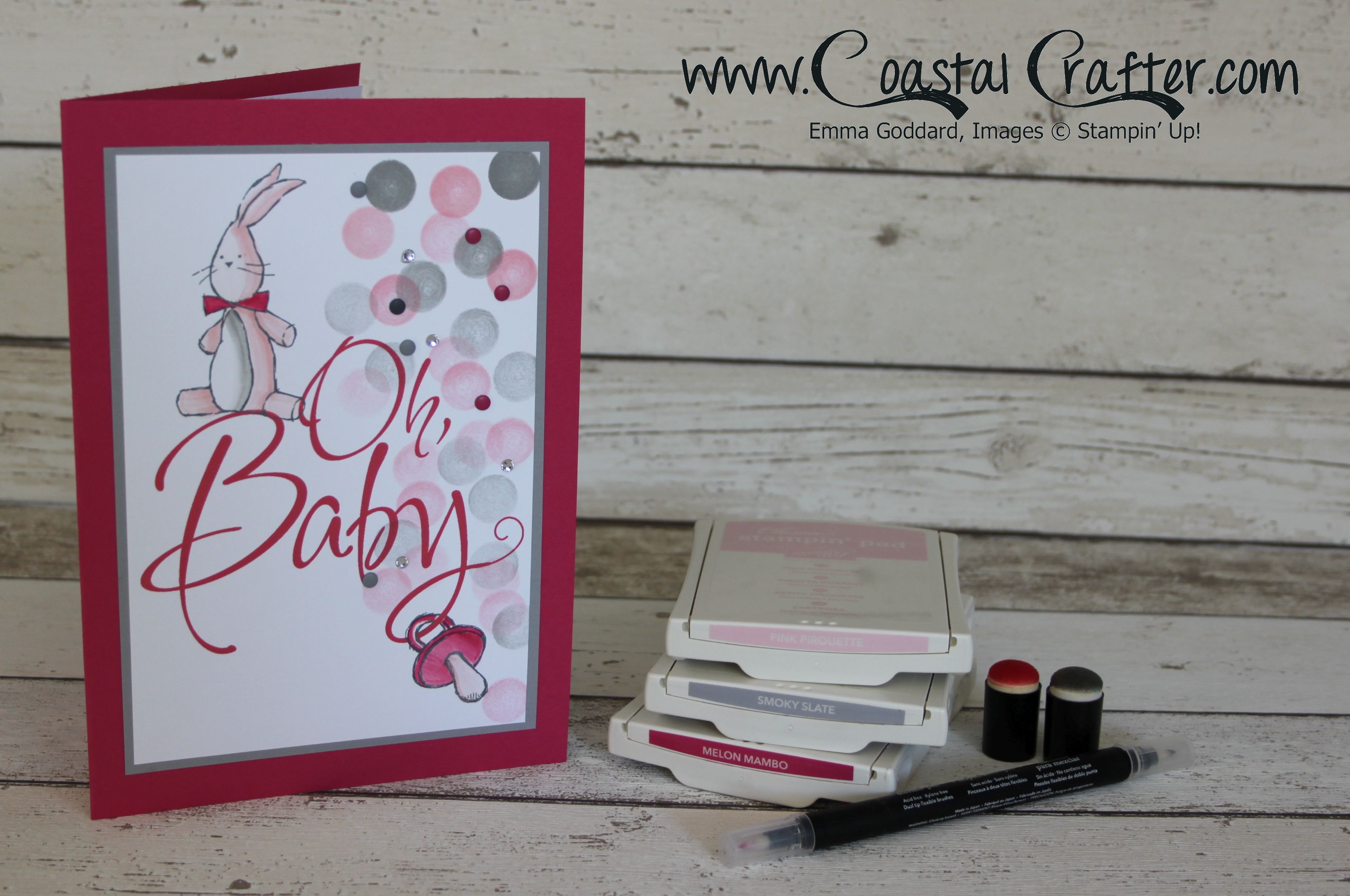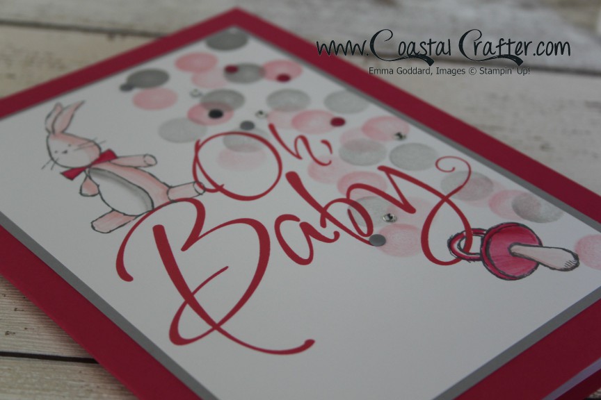 This was printed onto A4 Whisper White card stock and cut to size. The bunny and dummy has been coloured using the blender pen & coordinating inks. Once this was complete I used 2 sponge daubers to make the background. Each dauber was inked up (Pink Pirouette and Smoky Slate) always starting at the top with the darker ink, this gave the faded effect as it goes down the page – this was layered on the Smoky Slate Card stock.